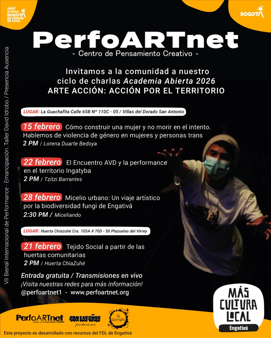 PerfoArtNet – Centro de Pensamiento Creativo con su proyecto Arte Acción: Acción por el Territorio, invita a participar con una charla a organizaciones sociales, organizaciones comunitarias, artistas, activistas, defensores de los derechos humanos, defensores ambientales, procesos para la transformación social y demás proyectos pertenecientes a la localidad de Engativá para ser parte de ACADEMIA ABIERTA 2026. Un proyecto de investigación, creación y acción artística en la localidad de Engativá -Bogotá.