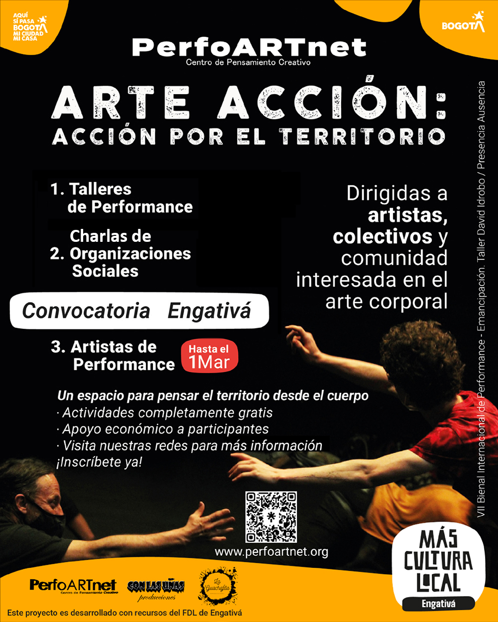 Arte Acción: Arte Acción por el territorio de Engativa Gestión Cultural/investigación/Curaduría Miguel Ángel González / Fernando Pertuz / PerfoARtNet Diseño gráfico: Orley Flórez Asistente de producción Lugar La Guachafita - Engativa - calle 65b # 110c-05